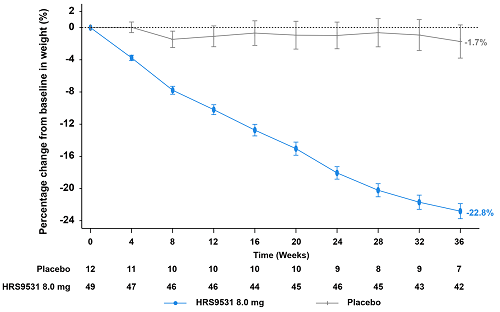 第36周腰围和BMI降低情况:HRS9531注射液8 mg组和安慰剂组的腰围较基线最小二乘均值变化分别为–17.9 cm和–2.5 cm。第36周时,HRS9531注射液8 mg组和安慰剂组的BMI较基线最小二乘均值变化分别为–7.1 kg/m²和–0.7 kg/m²。