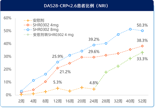 接受艾玛昔替尼治疗后,疾病缓解和低疾病活动的患者比例显著增加,且持续至52周,8mg组DAS28-CRP<2.6患者比例为50.3%, DAS28-CRP≤3.2患者比例为70.2%(图3)。